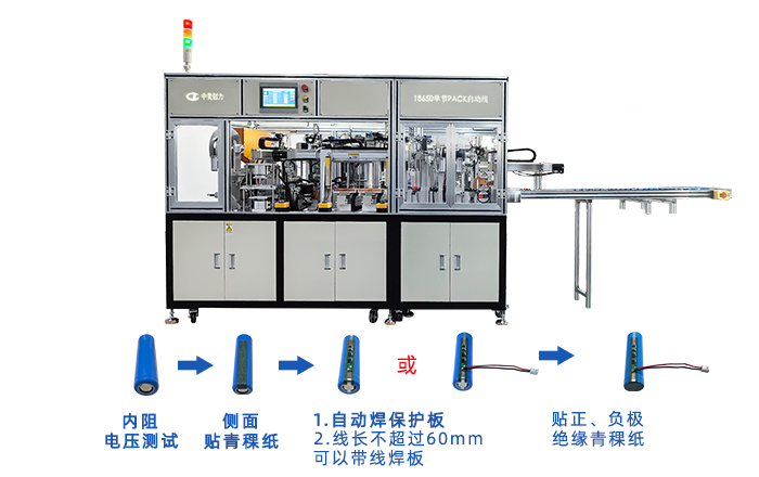 單節 PACK 自動線是一款將單節圓柱電池進行內阻電壓測試、側麵貼青稞紙、自動點焊保護板、電池兩側正/負極貼絕緣青稞紙多種功能集成在一起的全自動設備。該設備首先對單顆電芯進行內阻電壓測試,將不合格或者放反的電芯剔除,再對電芯側麵貼上寬度和長度可調的青稞紙,然後通過機械手抓取保護板同時點焊到電芯兩側,最後再對電芯兩側正/負極貼上絕緣青稞紙。該設備采用雙工位同步自動點焊,高精度伺服模組抓板及上下取放產品,精度高,速度快等特點。整機采用EtherCAT 總線集成控製,集成度高、布線少、故障率低等特點,此設備每小時生產電芯可達 2000 支,並可節約人工 3~4 人。結構設計簡潔大方,性能穩定。